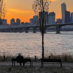 Chiều hoàng hôn: Ánh nắng vàng rơi trên mặt sông, cầu và cỏ hòa cùng gam màu ấm